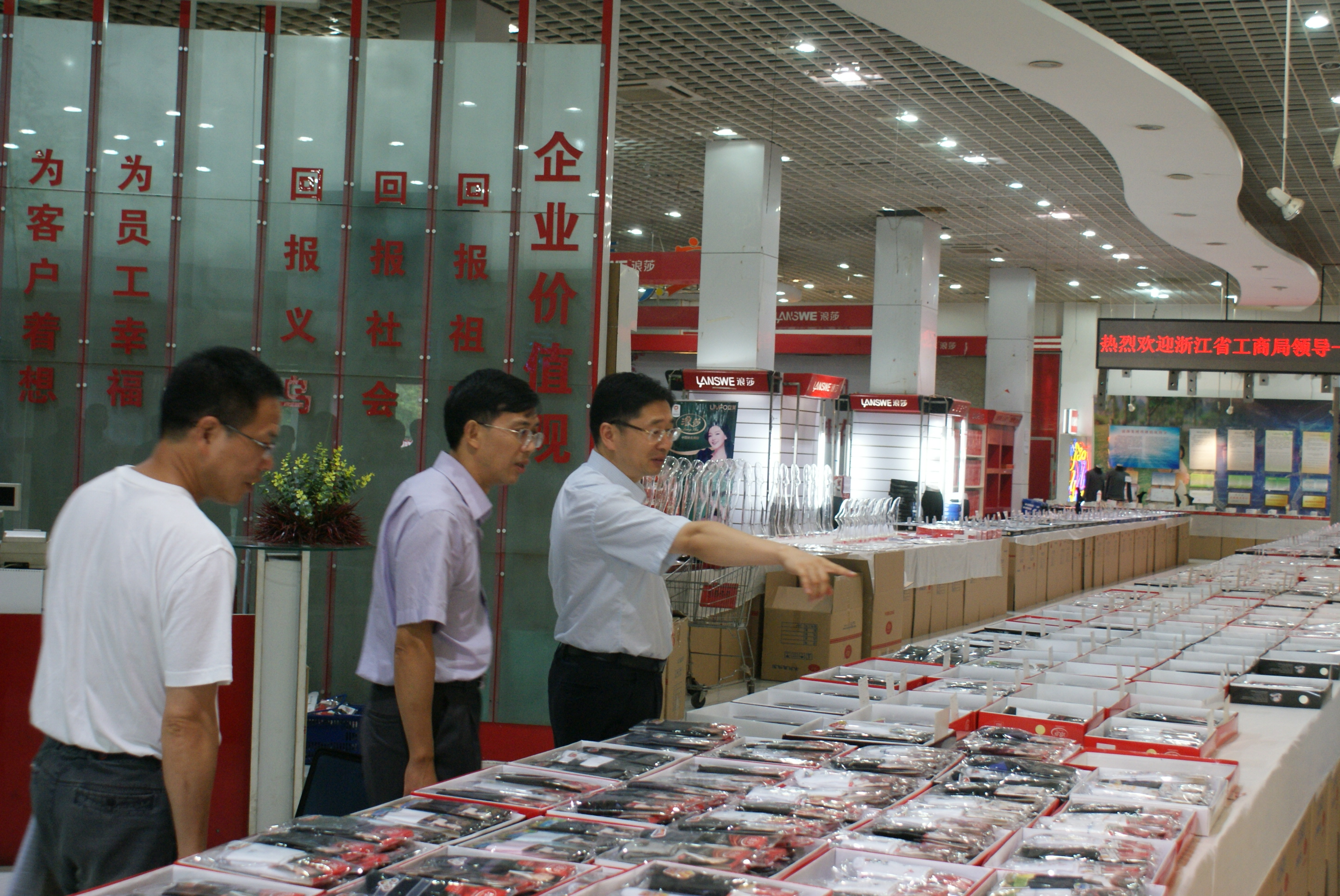 2012年9月13日,省工商局領導一行在義烏市襪業行業協會秘書長金善富的陪同下來浪莎參觀考察。董事長翁榮金親自接待,并進行了密切交流。