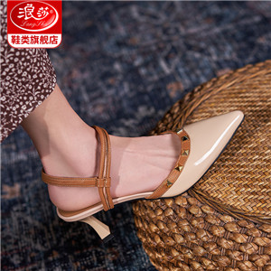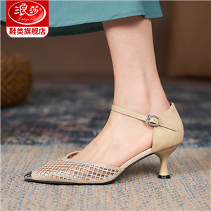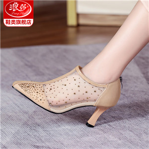 浪莎法式尖頭高跟鞋女細(xì)跟2021春夏新款深口鏤空網(wǎng)紗水鉆休閑單鞋