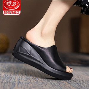 浪莎坡跟涼拖女外穿2021春新款夏天時(shí)尚高跟真皮懶人厚底魚(yú)嘴拖鞋
